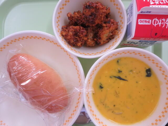 【チーズパン 揚げたこ焼き パンプキンポタージュ 牛乳】