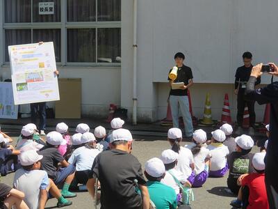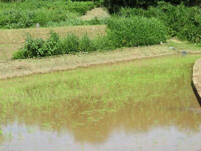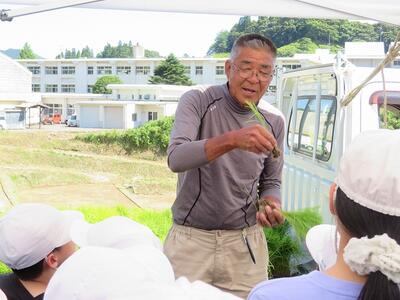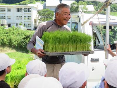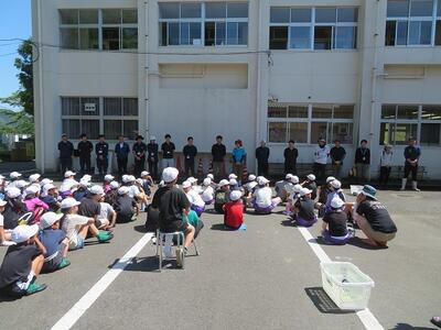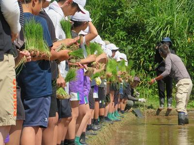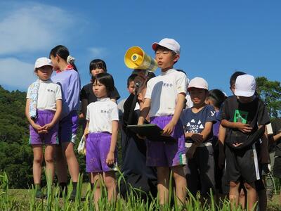 6月5日(木)に生産活動を行いました。1・2年生が芋の苗植え、3~6年生が田植えを行いました。まず初めに、全員が集まり西臼杵支庁様より説明が行われました。田の仕組みや働きなどを学びました。そして、この日に協力してくださる方々の紹介がありました。たくさんの方々が関わってくださることに驚き、とてもありがたい環境であることを実感しました。