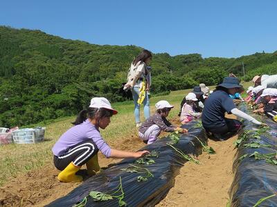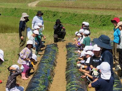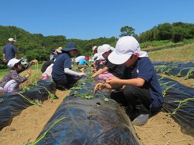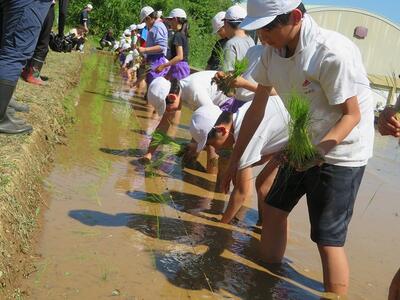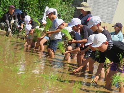 いよいよ活動開始。学校の体育館の西側にある実習田に移動しました。芋の苗植え、田植えの説明がそれぞれで行われ、楽しそうに活動しました。1・2年生は、畝のマルチの穴の中に、懸命に芋の苗を植えました。一方、3~6年生は、ひもの印の間隔にそって田植えを行いました。慣れない田の泥に苦戦しながらも懸命に田植えを行いました。どちらも終了し、指導をしてくださった方々に感謝の気持ちを伝えました。