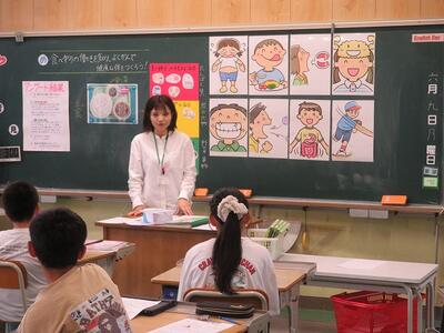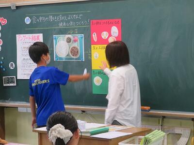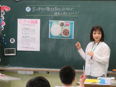 栄養教諭が、授業を行いました。今回は、6年生を対象にした授業です。6年生の児童は、「食べ物の働きを知り、よくかんで、健康な体をつくろう」というめあてで学習を行いました。これまでの食生活について振り返ったり、食べ物を3つの仲間に分けたりしました。また、かむことが体に及ぼすよい影響についても考えました。その日の給食の献立の中に、かむことを意識したおかずがあり、学習したことを考えながらおいしく食べていました。今回の学習をぜひ日常生活に生かしてほしいと思います。