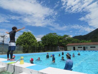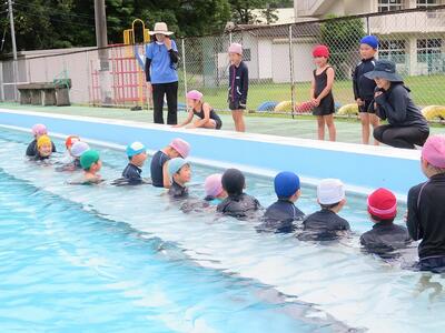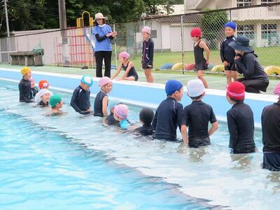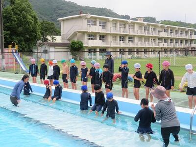 6月12日(木)にプール開きが行われました。予定では、高学年が10日(水)、中学年が11日(木)でしたが、雨の影響で実施できませんでした。12日(木)は、雨がやみ、雷の影響もなく、気温が上昇したため1・2年生が今年度初めてのプール開きとなりました。この日を待ち望んでいた子どもたちは、楽しそうにプールでの学習に臨んでいました。これから、7月中旬まで水泳の学習が行われます。安全で楽しい学習の時間にしてほしいと願っております。