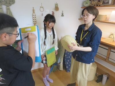 4年生は、総合的な学習の時間にわら細工について学びました。今回は、「わら細工たくぼ様」を訪れ、作業場や展示室の見学を行わせていただきました。わら細工について説明を受けたり、作業場で実際に作業をしている様子を見学させていただいたりしました。また、見学の中で出てきた疑問について質問し、答えていただいた内容を懸命に記録しました。今回の見学を通して、日之影町に伝わるわら細工のすばらしさを実感し、日之影町の魅力を再発見した子どもたちです。