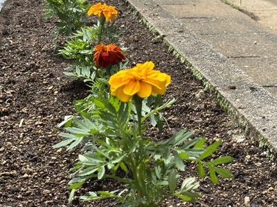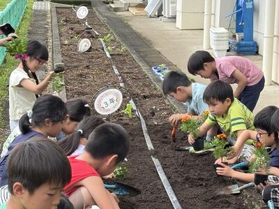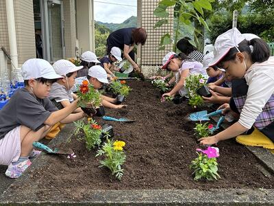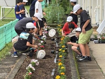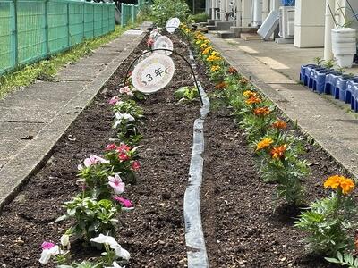 雨が多かった今週、雨の合間を見て各学年で花の苗植えを行いました。今回植えたのは、マリーゴールドとニチニチソウの苗です。子どもたちが、心を込めて苗を植えていました。