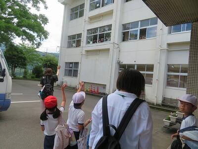 これまでの交流に加え、当日の学習での交流も加わり、お互いに打ち解けた子どもたち。それそれの学校に帰るためにスクールバスに乗り込む場面では、お互いに手を振り合う姿が見られました。一段と心を通わせ合うことができた日之影町の子どもたちです。