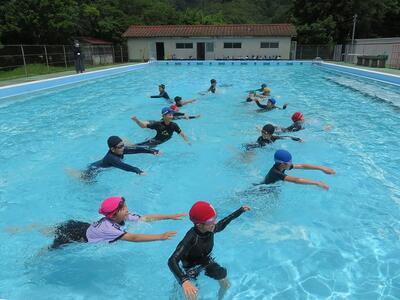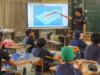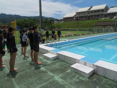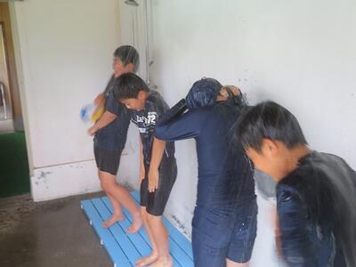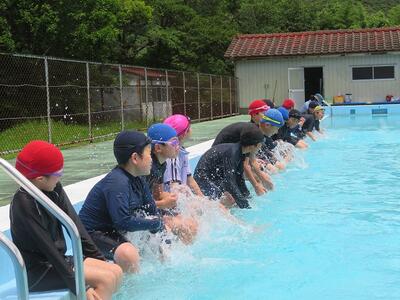 6月17日(火)に、5・6年生のプール開きを行いました。まず初めに、教室で校長の話や担任からのプールでの約束等についての説明をしました。その後、プールに移動し、準備運動やシャワーを行いました。特に、シャワーの場面では、久しぶりの場面と水に冷たさに声を上げていました。そして、いよいよプールの中へ。足から順番にプールに入り、水慣れをしました。だるま浮きや伏し浮きなどを行いながらさらに水慣れをしました。今後、本格的な水泳の学習が始まります。5・6年生の子どもたちは、それぞれが昨年度の泳力を超える目標を立てました。目標に向かって努力し、学習終了時には達成感を味わうことができる充実した学習をしてほしいと思います。