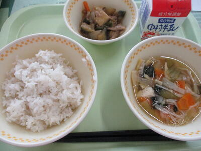 今日は、今が旬のなすをみそ炒めにしています。なすの皮は、濃い紫色をしています。これは、ナスニンという色素です。このナスニンは、がんや生活習慣病を防ぐ働きがあります。このナスニンを効果的にとるには、油と一緒に調理することです。今日の給食では、油と一緒に炒めて作っています。