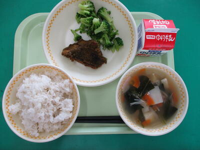 今日の魚のみそ汁の魚はタラです。魚には良質のたんぱく質やカルシウムなどの体をつくるために必要な栄養素が含まれています。給食では一週間に一回は魚料理を取り入れるように献立を作成しています。丈夫な体をつくるためにも、おいしい魚をたくさん食べてほしいと思っています。