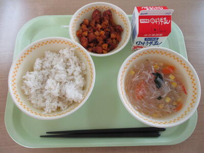 今日は厚揚げを使ったそぼろ煮です。給食では豆・豆製品を使った献立を1週間に1度入れるようにしています。厚揚げや豆腐、がんもどき、大豆、ミックスビーンズなど様々な豆・豆製品を取り入れていますので、どんな豆・豆製品が使われているのか考えながら食べてくれたらうれしいです。