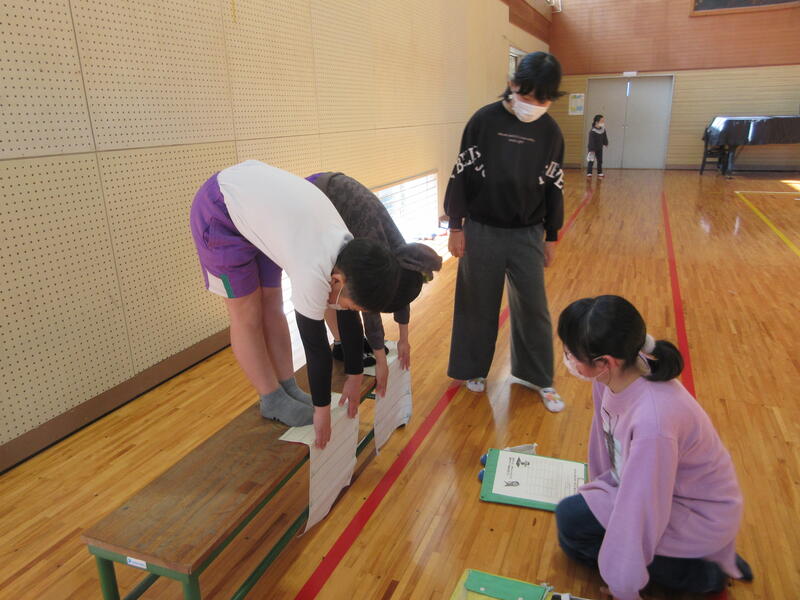 体力テストの結果では、長座体前屈はどの学年も全国平均より数値が低くなっていました。日常的にストレッチなどに取り組んで柔軟性を高めていきたいですね。