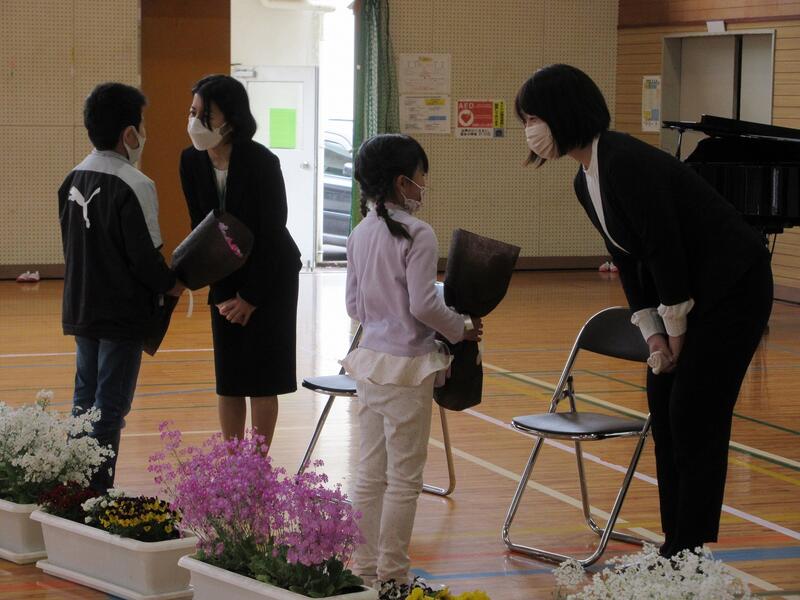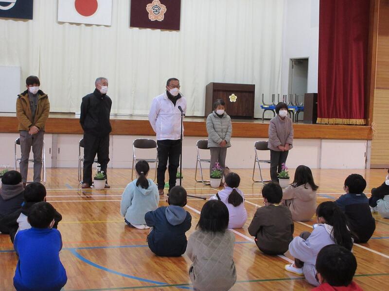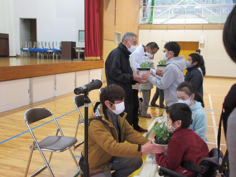 毎日、いろいろな場面で地域の方々や保護者の方々にお世話になっていることを改めて感じました。その後、6年生がお礼の言葉を伝え、各学年代表児童が花のプレゼントを渡しました。