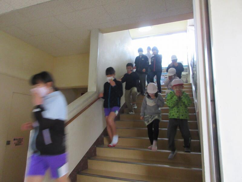 Jアラートの警報と「地震です、自分の命を守る行動をしましょう」の放送で、さっと身を守る行動ができたようです。また「揺れが収まりました。運動場へ避難をしましょう」の合図で、静かに素早く避難をしていました。