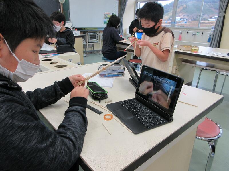 ものづくりクラブの子どもたちは、ゴムでっぽうを作っていました。タブレットを使って作り方を調べ、画面を見ながらどうやったらよく飛ぶかを考えて工夫をしていました。