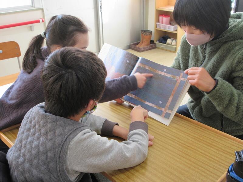 1年生は、「どこに〇〇があるか見つけられるかな?」などの、先生からの問いかけに、絵本に描かれてあることをもっとよく見ようと身を乗り出して聞いていました。