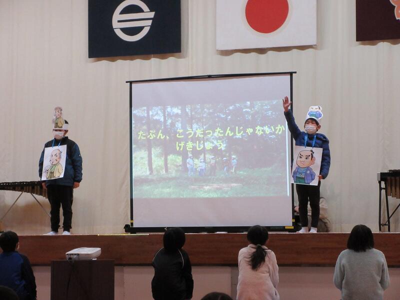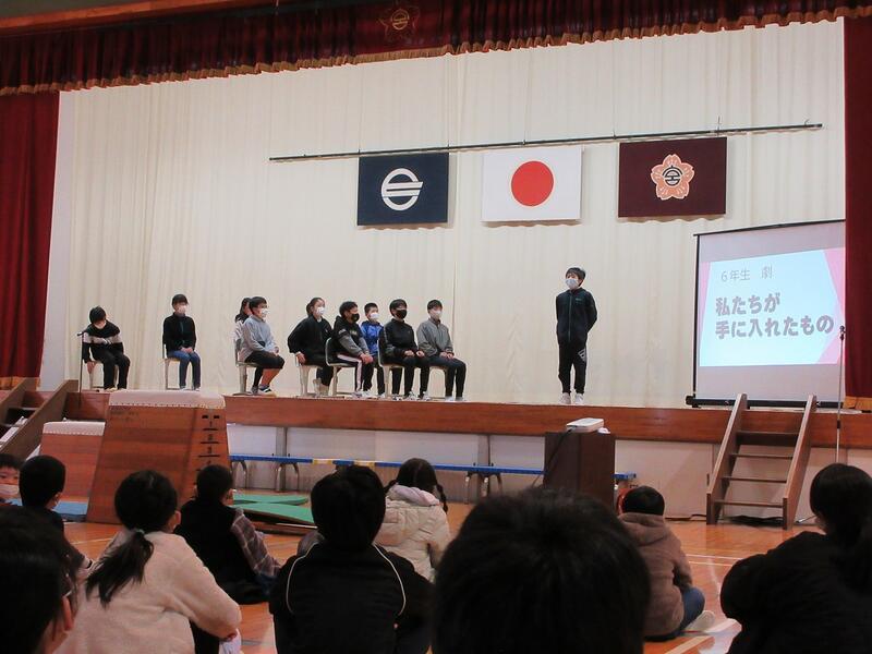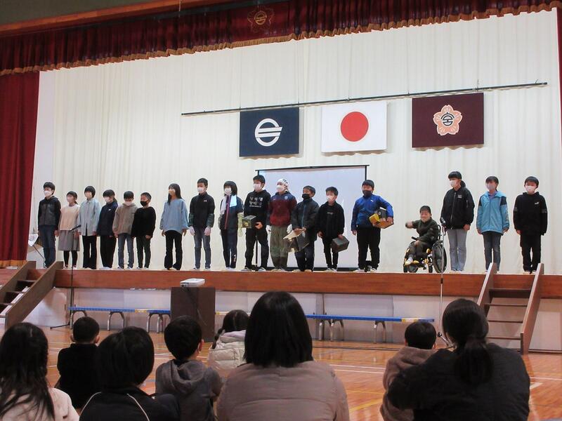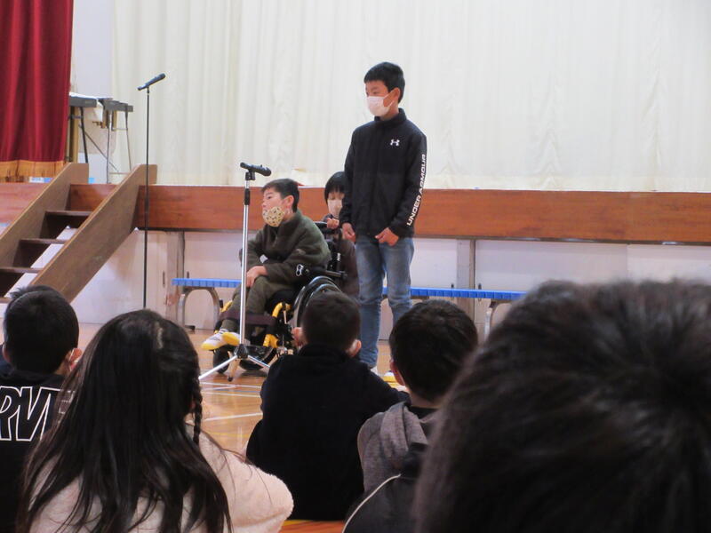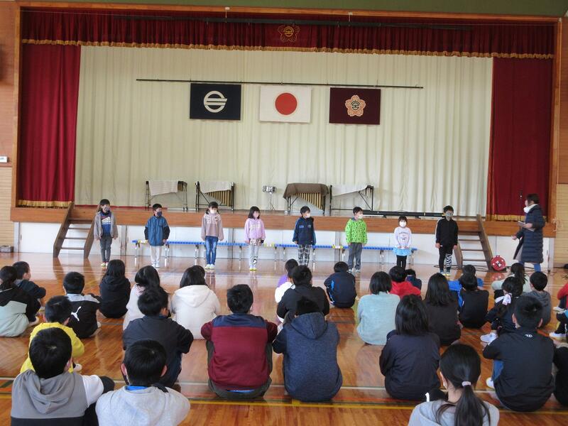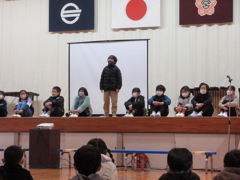 先日の「町民のつどい」で6年生児童が意見発表を行いましたが、たくさんの方々に称賛のお言葉をいただきました。ありがとうございました。今日は、地区別集会で全校児童が集まる機会がありましたので、みんなにも発表をしました。