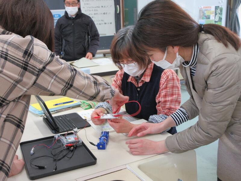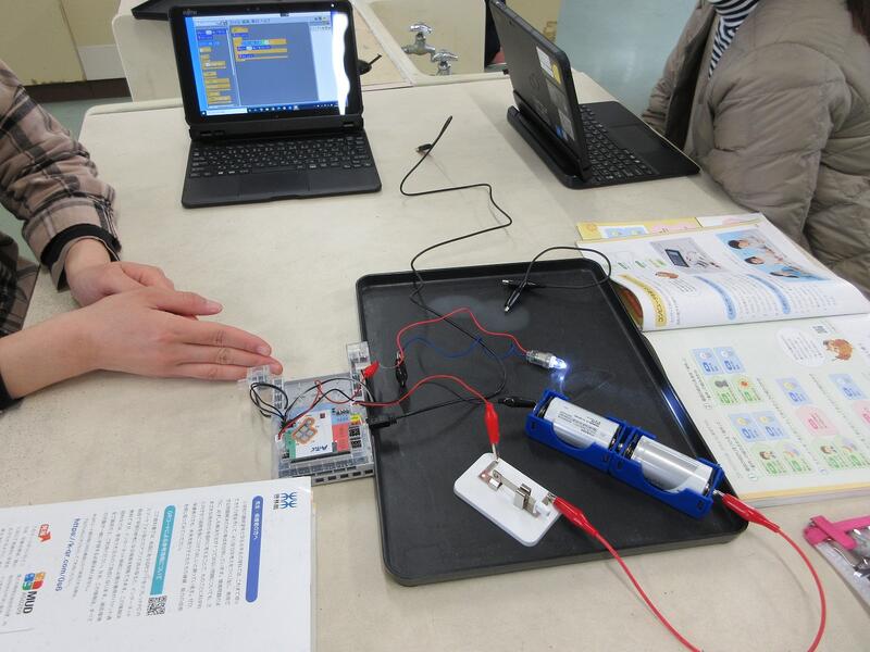 6年生の理科では、プログラミング教材を使って、人が近づくと明かりがついたり、音がなったりするなどの仕組みを作っていく学習があります。今回は、職員も実際に子どもたちと同じ体験をしてみました。