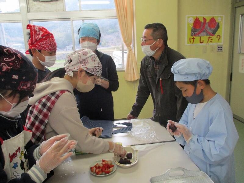 まず、自分たちが収穫したもち米を使ったスイーツづくりをしました。子どもたちの手つきを見ながら、アドバイスをしてくださったり、楽しい会話をしたりするうちに、いちご大福ができあがりました!