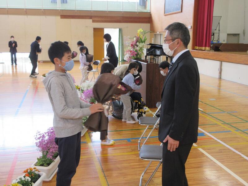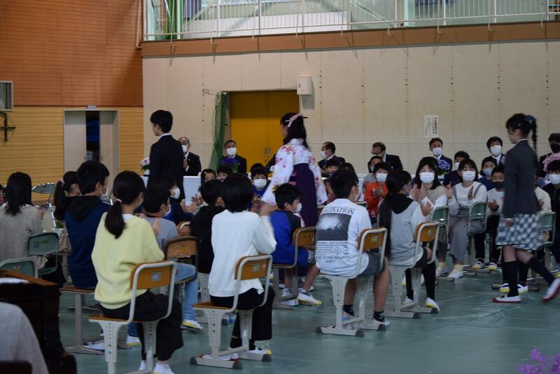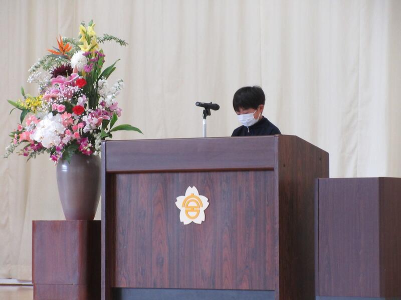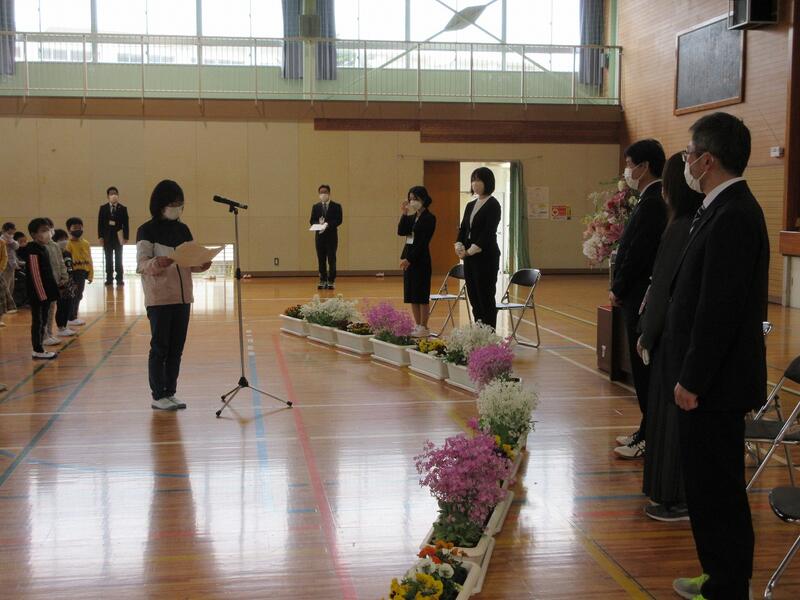 次に、5年生の代表児童からのお礼の挨拶と花束贈呈を行いました。