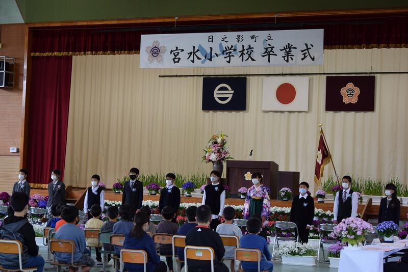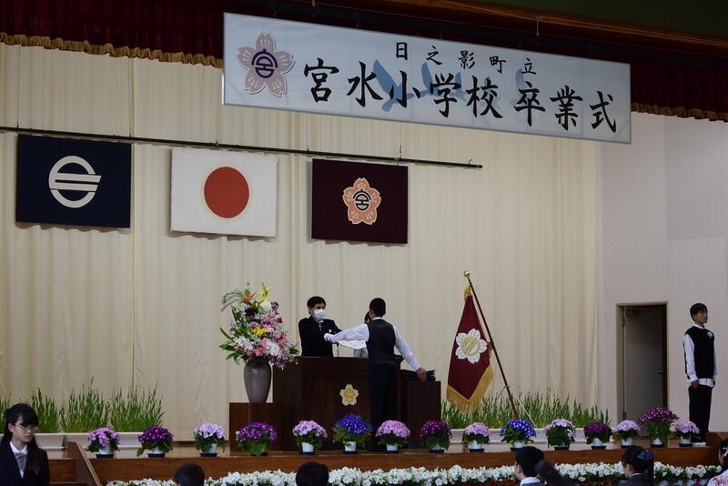 3月23日(木)、宮水小学校第76回卒業式を行いました。昨日まで降っていた雨も今朝は上がり、校庭の桜も卒業を祝うようにきれいに花を咲かせていました。