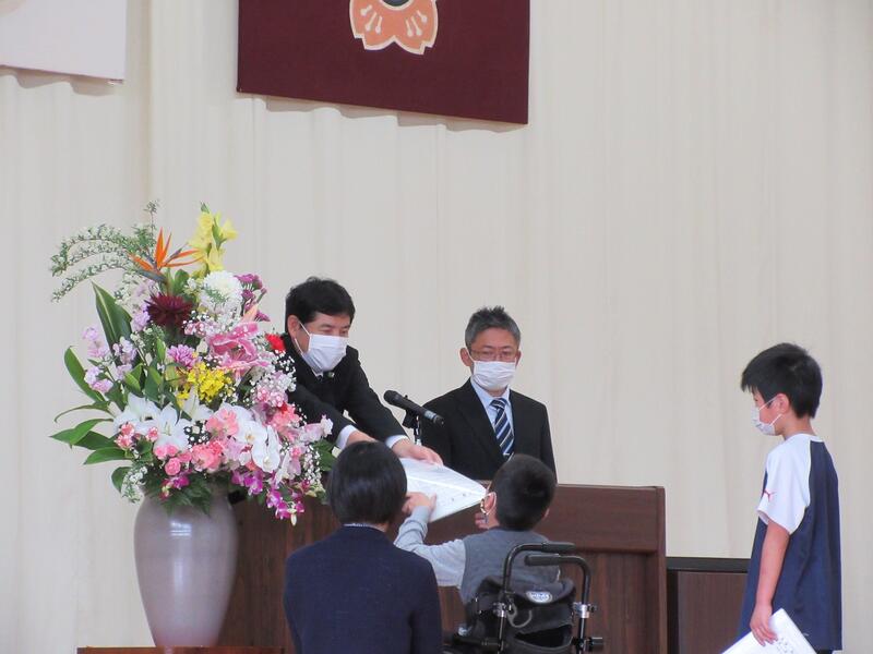 はじめに、5年生から順に各学年の代表児童へ修了証が渡されました。卒業生は卒業証書ですが、1~5年生はその学年で学習する内容を修了したということで、修了証を校長先生から受け取ります。