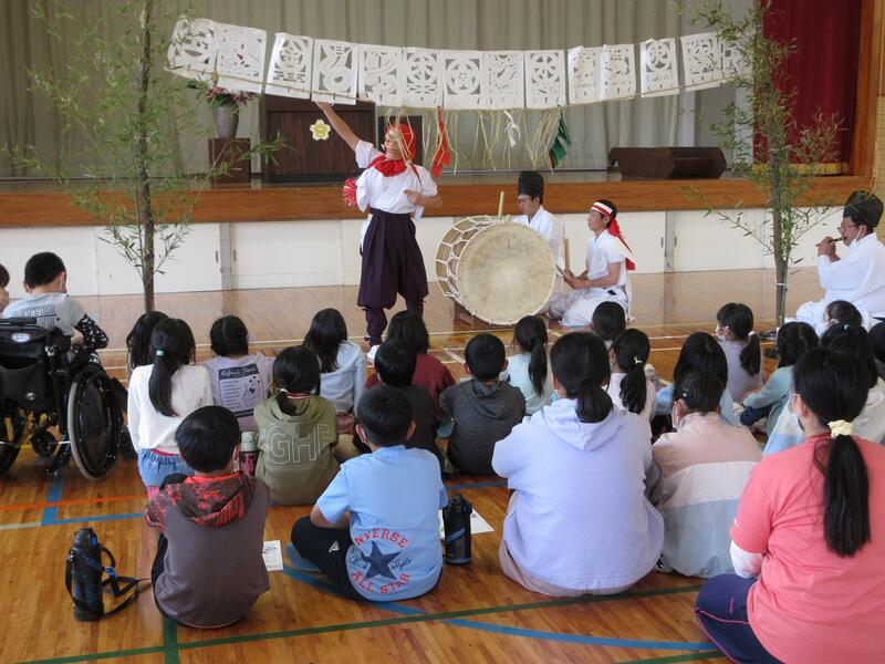 今日は、子どもたちに地域の神楽に親しんでもらおうと「大人(おおひと)神楽保存会」の方が来校されました。