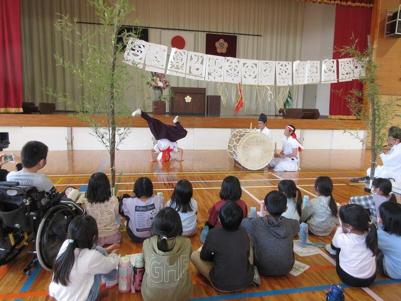 太鼓や笛の音を間近で聞くととても迫力があり、子どもたちは集中して神楽に見入っていました。