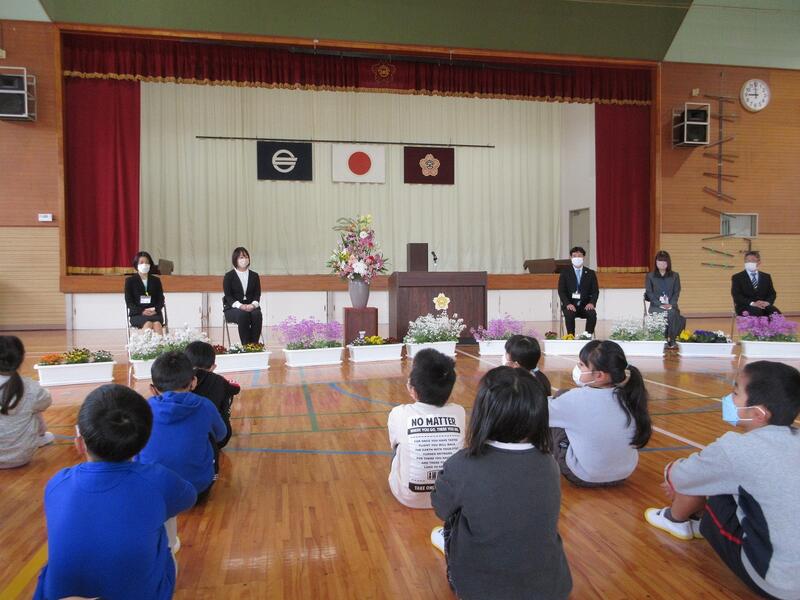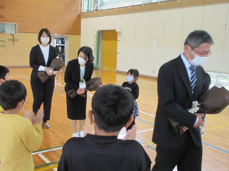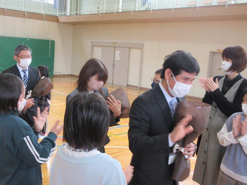 本日、令和4年度の定期異動により宮水小学校を転出される4名の先生方とご退職をされる先生との離任式を行いました。