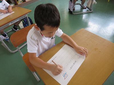 1年生に、「歯の王様を守ろう」の授業をしました。歯の王様とは、6才臼歯のことです。自分に6才臼歯が生えてきているかを確認し、上手に磨く練習をしました。また、むし歯予防の効果もある「あいうべ体操」も一緒にしました。最後には、歯の王様に「歯ブラシをよこから入れるよ」「こちょこちょ磨きをがんばるよ」などとお手紙を書いてくれました