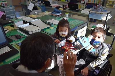 タンポポ学級の二人が、工作でつくった鬼を見せに職員室に来てくれました。