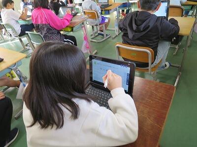 5年生の算数の授業では、児童がタブレット上に書いたメモをもとに、ペアで話し合いました。そして、そのメモをモニターにうつして、全体に発表していました。