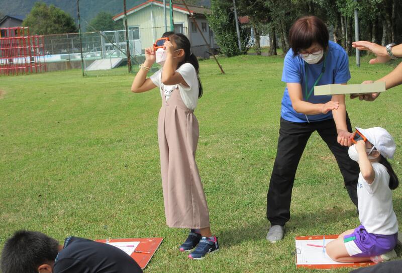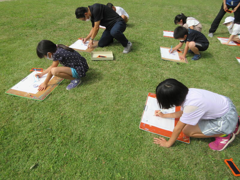 また、遮光グラス(太陽を見るための道具です)を使って、太陽がどちらに見えるのかも調べていました。直接太陽を見ると目をいためますが、この道具だと太陽の形もはっきり見えるので子どもたちも感動していました。