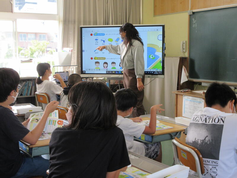 5年生の教室では、クリステン先生と外国語の学習で、ものがどこにあるのかを表す言い方を考えていました。机の上、下、横など、ものがある場所でくっつく言葉が、on や under by などと変わります。いろいろな言い方に慣れることが大事ですね。