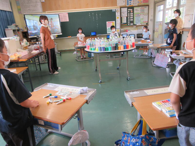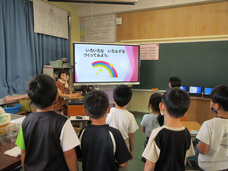 最後は、今日の学習の振り返りです。「色をまぜるとたくさんきれいないろができました」「〇〇さんのは同じ赤色だけど、少し色が違うと思いました」など、子どもたちはたくさんの発見をし、絵を描く際の色づかいにつながる学びがありました。
