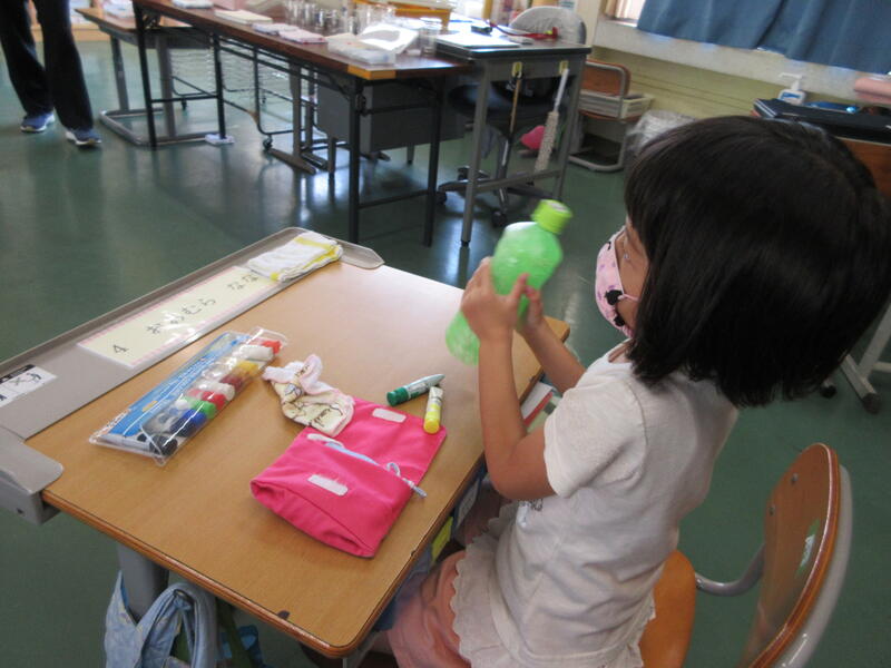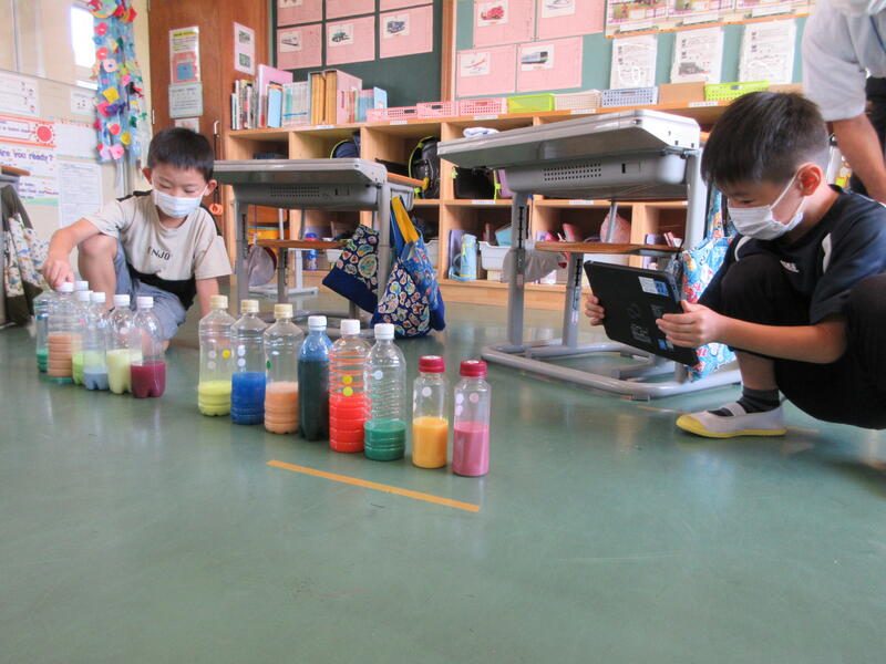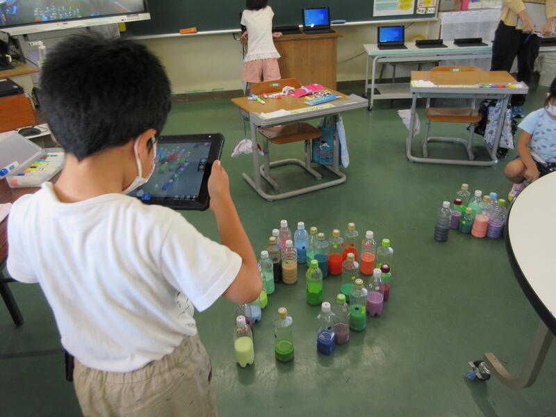 その後、タブレットPCを使って色水の写真を撮りました。ペットボトルを真っ直ぐ並べる子、同じ色で並べる子、虹や花火みたいにしようと考える子など、自由な発想を生かしてどうやったらきれいに面白く見えるかを考えていました。このような場面が、思考力や表現力を高めることにつながるのではないかと感じました。