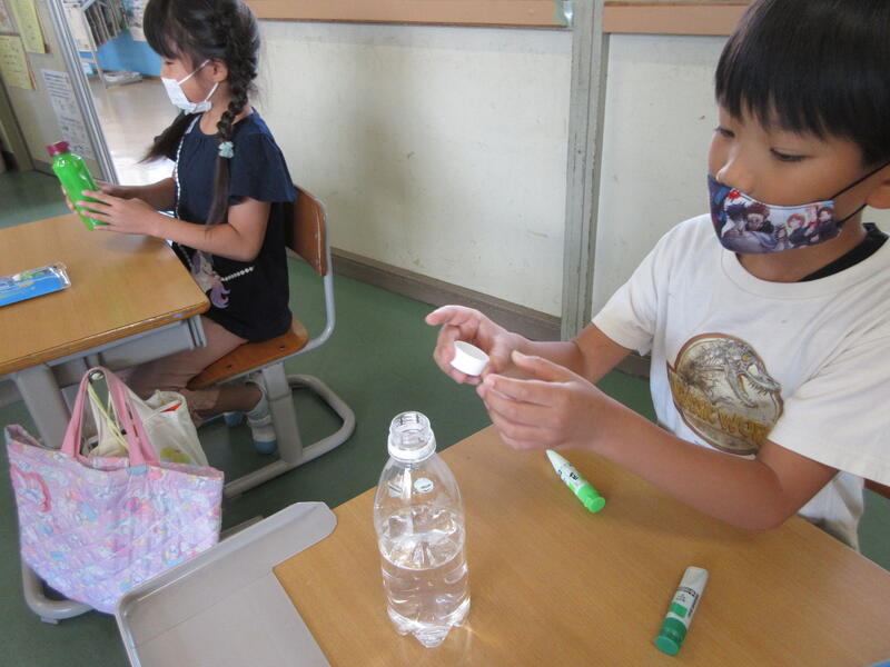 次に、前の時間に自分たちが考えていた色の混ぜ方を、絵の具を使って実際にやってみました。ペットボトルのふたの裏に絵の具を乗せ、水の入ったペットボトルにふたをして振ると・・・