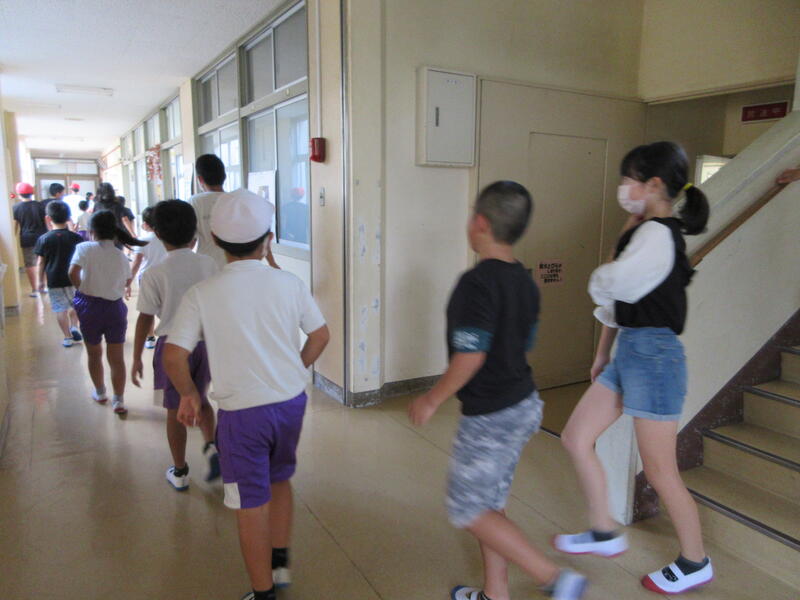 今回は子どもたちに時間を伝えずに、地震を想定した避難訓練を行いました。掃除場所に移動していた子どもたちが、その場所で自分の身を守り、しっかりと避難できるかの訓練です。