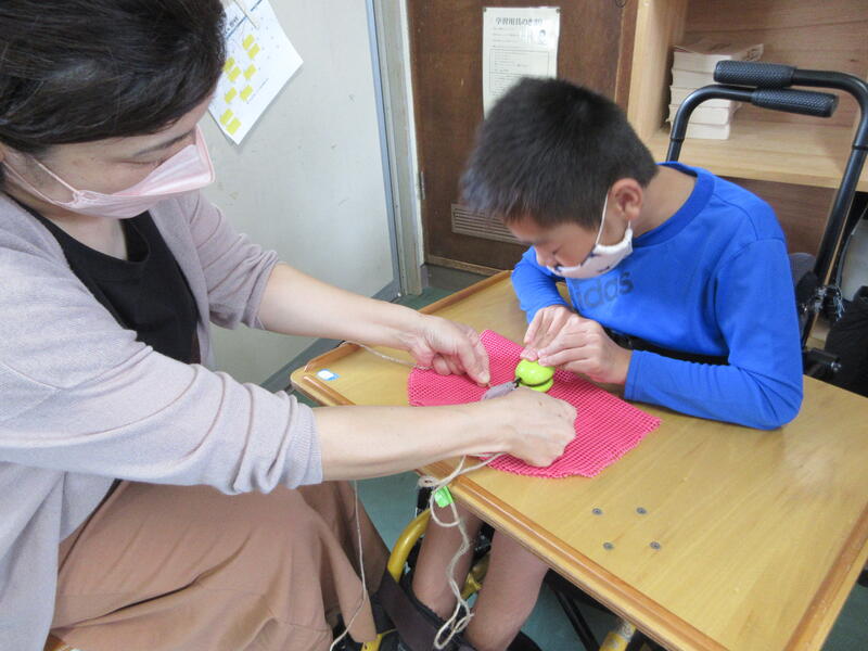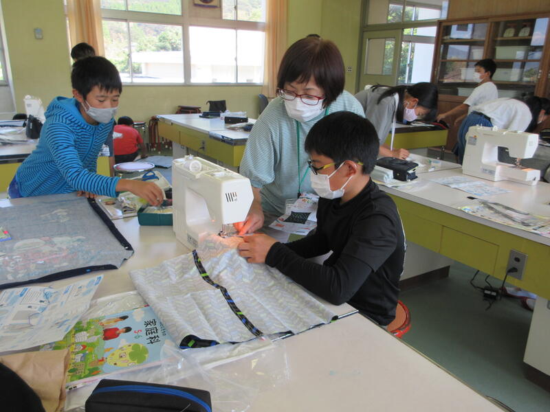 6年生が家庭科の学習で、エプロンやナップザックなどを作っていました。アイロンやミシンなどを使いますので、安全のために支援員の先生が一緒にお手伝いをしていました。