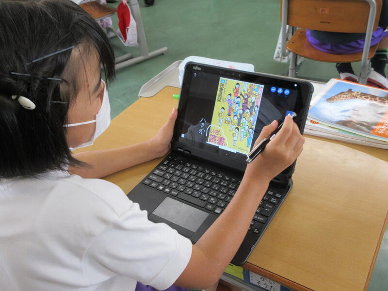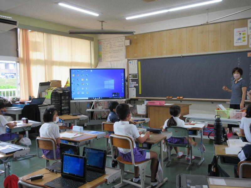 今年度は、児童の思考力・表現力を高めるために、ICTを活用した授業の工夫・改善に取り組み、1人一授業の実践を行っています。今日は、3時間目に1年生教室で、図工の授業が行われました。