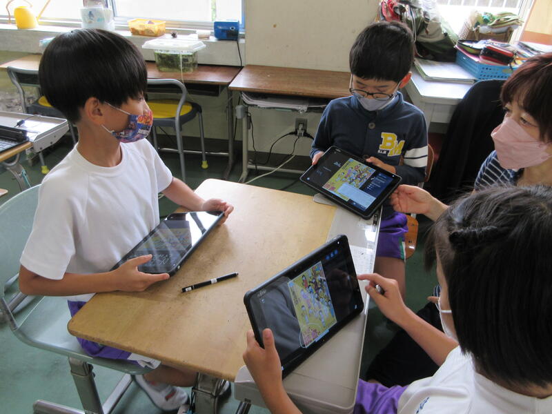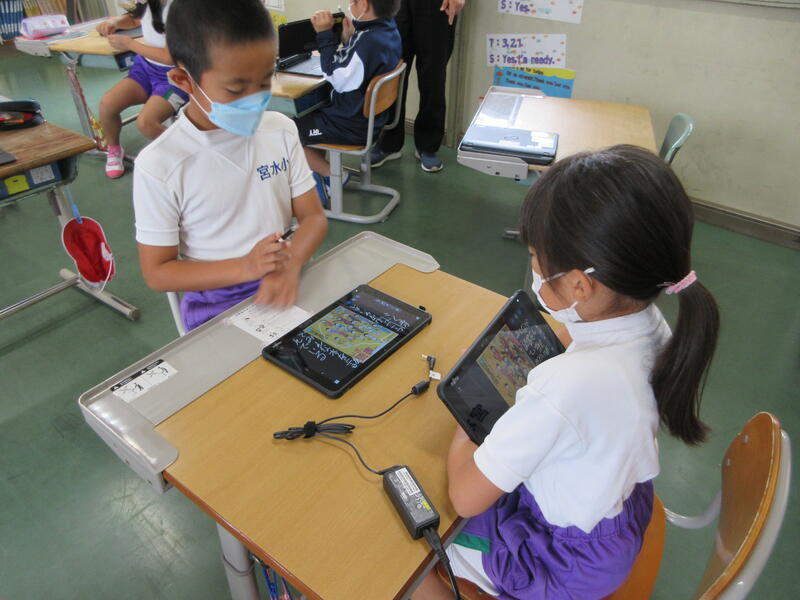次の時間には、タブレットPCで撮った写真をみんなで鑑賞し、友達のよかったところ、どんなものの色に似ているかなどを発表して、さらに学習を深めていくようです。