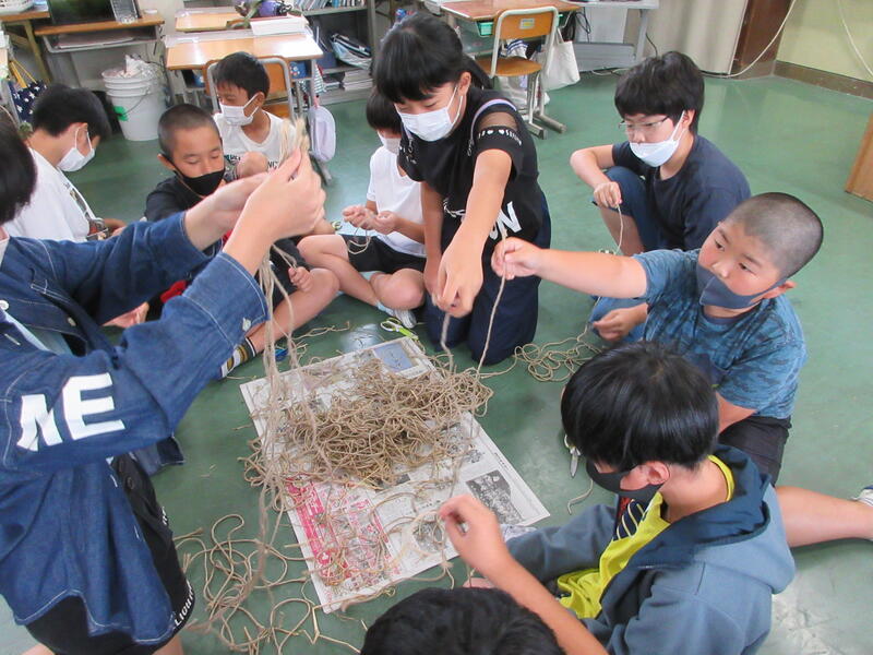 まずは、3つのグループに分かれて、学校にある千歯扱きや足踏み脱穀機を使い脱穀作業の体験をしました。