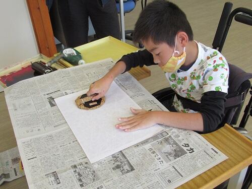 次に、画材に紙を載せてバレンを使って紙にインクを刷り込みました。インクがしっかり付くように何度も何度も刷り込みました。