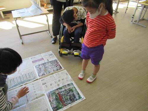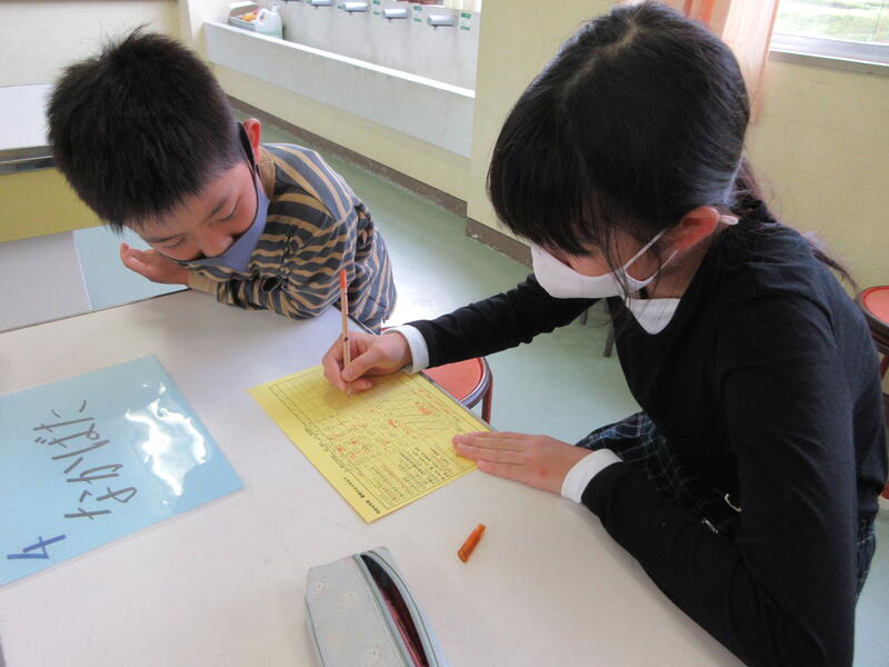 文字の大きさや改行、写真の配置、項目ごとに印をつけるなど、友達が見やすいように工夫することも大事です。先生のアドバイスを聞きながらしっかりと見直しをしていました。