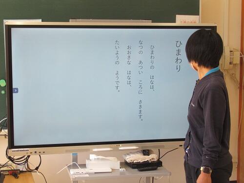 まず、音読をしました。電子黒板を使ってゆっくり丁寧に音読しました。