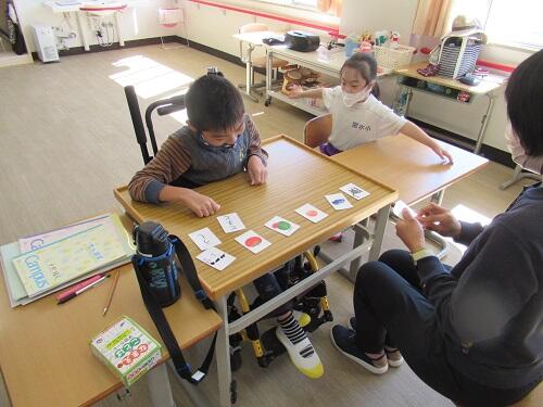 次に、カードのイラストを声に出して読みました。今度は、先ほどのイラストの言葉が書かれてあるカードを読みました。最後に、イラストとイラストの文字を読みながら組み合わせていきました。