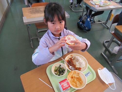 ハヤシライスも高千穂牛が入っていてとてもおいしかったです。子どもたちは、いつもの給食を食べた後、スペシャルデザートをうれしそうにスプーンで口に運んでいました。このアイスクリームは、地域振興課からのプレゼントだそうです。ありがとうございました。
