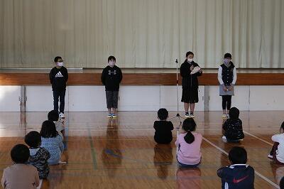 校長先生からは、友達への言葉遣い、心遣いをすることの大切さについてのお話でした。「元気のないひとがいたら?」「ひとりぼっちでいる友達がいたら?」と問いかけに、子ども達は「声をかける。」「一緒に遊ぼうと言う。」などと、友達を思いやる発言をしていました。