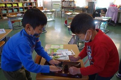 1年生が、生活科の時間に松ぼっくりを使って、楽しく遊んでいました。