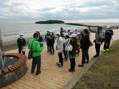 青島見学に来ました。神話と青島の地形の説明を聞きました。鬼の洗濯板を近くで見ることもできました。