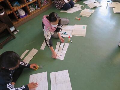 各自が段落ごとにまとめた短冊を使って、大きなまとまりについて考えました。子ども達は、自分と違う友達の考えと意見を交わすことで、考えを深めることができました。