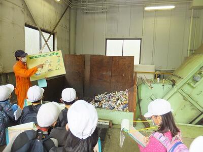 アルミ缶とスチール缶が機械を使って分別され、リサイクルにまわされている様子を見て、びっくりしていました。また、ごみピットやごみクレーンの巨大さに驚いていました。