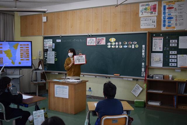 今日は地産地消給食の日です。今日だけでなく、給食には、西臼杵地区でとれたしいたけを使っています。いつも使うしいたけは乾燥させた干ししいたけですが、今回は生のしいたけを使いました。油で揚げたしいたけとさつまいもに、酢と砂糖、しょうゆなどを合わせた南蛮酢をかけて和えました。味わって食べてくださいね。